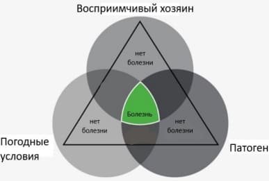Есть такое понятие как «треугольник болезни», каждая из сторон которого отвечает определенным требованиям. Первая сторона — собственно растение-хозяин, оно должно быть восприимчивым к данному заболеванию. Вторая сторона — наличие самого патогена. Третья сторона — условия окружающей среды должны быть благоприятны для заражения. Необходимо что бы совпали все три условия.