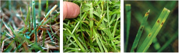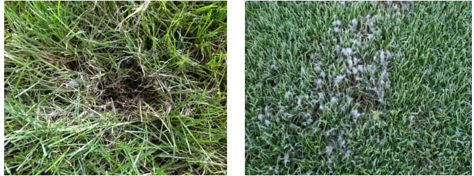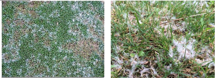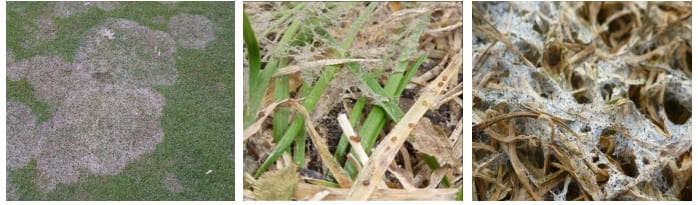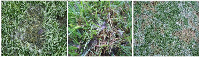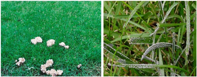 1. Плесневый налет на листьях, хорошо заметный рано утром, на росе, характерен для «Питиума» и «Долларовой пятнистости», «Розовой снежной плесени», «Серой снежной плесени», отчасти «Красной нитевидности».