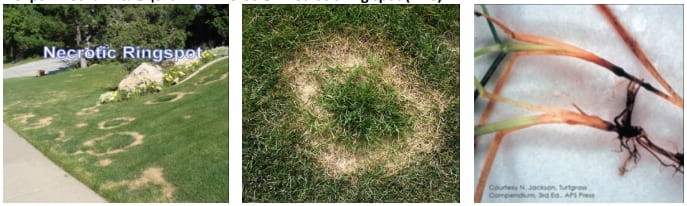 Является специфическим заболеванием старых мятликовых газонов. Более актуально для южных регионов России. Вызываются возбудителем — Ophiosphaerella korrae. Симптомы проявляются как поздней весной, так и в начале осени, в период активного роста корневой системы. Оптимум температур для развития пятнистости лежит в пределах от 17°С до 27°С. Вначале появляются небольшие пятна более светлого цвета, которые разрастаясь образуют кольцо в виде бублика с здоровым газоном внутри, кольцо обесцвечивается и «проседает», между здоровыми и зараженными растениями имеется красно-коричневая граница. Такое образование называется «лягушачьим глазом», сходные симптомы так же у летнего фуариоза, только период развития несколько иной, он появляется в конце июня — в июле и размер пятен меньше, затем осенью исчезает. Зачастую локализована в определенном месте газона, и заражение в этом месте будет проявляться и в последующие годы. Основание стебля, корни и корневища чернеют и перегнивает. В конечном итоге проникает в корневую систему, где поражает сам корень, перехватывая воду и питательные вещества. «Колонизация» корневой системы идет в период с весны до начала осени и до этого периода может, никак не себя не обнаруживать. Болезнь распространяется только на взрослых газонах, более 3 лет, хотя в некоторых случаях может не проявляться 10 лет и более. На переуплотненных участках протекает более тяжело. Зачастую появляется через 2-3 года после укладки рулонного газона на участках с переуплотненной почвой. Является проблемой в основном мятликовых возрастных газонов, частично может поражаться овсяница, райграс не поражается. Сорта мятлика из семейства Compact Midnight (а это основные сорта при создании рулонного газона) обладают хорошей устойчивостью к НКП. Для правильного диагностирования болезни лучше обратиться в лабораторию, так как симптомы очень сходны с симптомами других патогенов.