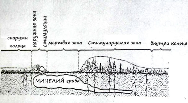 Ведьмины (волшебные, кольцо феи) кольца это довольно устоявшееся название этого заболевания. Распространено на газонах из любых видов трав, как холодного климата, так и теплого климата. В формировании может принимать до 50 и более грибов из класса Базидиомицетов из семейств Шампиньонов, Опят, Дождевиков и других семейств, все зависит от местоположения газона, климата, состава почв. Некоторые образуют плодовые тела, собственно грибы, но не образуют кольца, другие наоборот, не образуют плодовых тел, но образуют кольца. Кольца или дуги, возникающие на газоне, могут быть разных размеров, вплоть, до огромных, в несколько десятков метров, есть и такие старые кольца, идентификация которых возможна только с высоты птичьего полета, формы могут варьировать в зависимости от вида и условий окружающей среды. При этом плодовые тела могут и не появляться. Грибы, разлагая органику, в основном лигнин, как в почве, так и в войлоке синтезируют довольно много азота, которое используется травами газона, особенно этот контраст заметен на малообслуживаемых газонах, где вноситься небольшое количество минеральных удобрений, либо вообще не вносится. Появившись один раз на постоянном газоне, кольцо расширяется из года в год, потихоньку захватывая новые области с питанием. И чем ближе грибница поднимается к поверхности почвы, тем более высокая концентрация аммонийного азота и сульфидов в почве, такая концентрация становиться токсичной для корней газона, прекращается жизнедеятельность бактерий, утилизирующих эти вещества, в основном из-за недостатка влаги (данное явление называется гидрофобизация). Гидрофобизацию вызывает как сам мицелий гриба, так и продукты его жизнедеятельности при утилизации древесных материалов, которые могут находиться в почве по разным причинам, это могут быть и старые корни деревьев, и опилки, и кусочки древесины в торфе.