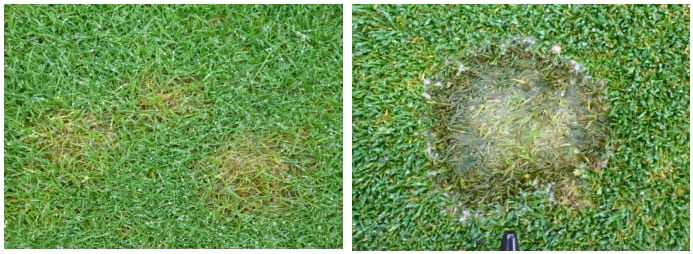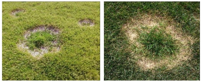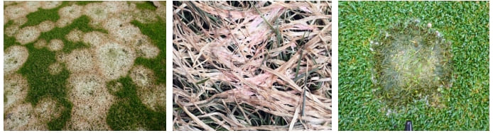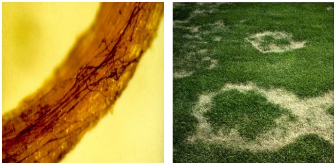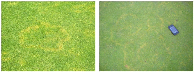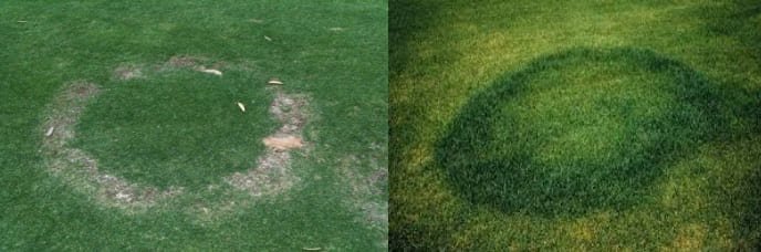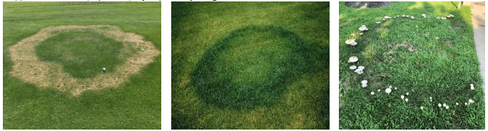 Различают три типа симптомов. Тип 1, самый пожалуй вредоносный, при котором почва гидрофобизируется и отталкивает воду, трава в кольце или дуге погибает и становиться соломистого цвета. Тип 2 проявляется в виде темно-зеленых колец или дуг в которых наблюдается активный рост травы. Тип 3 характеризуется появлением плодовых тел грибов и является более распространенным в течение длительных периодов влажной погоды. Все три типа в зависимости от погодных условий могут чередоваться друг с другом. Тип 1 и Тип 2 характерны для периодов сухой и жаркой погоды.