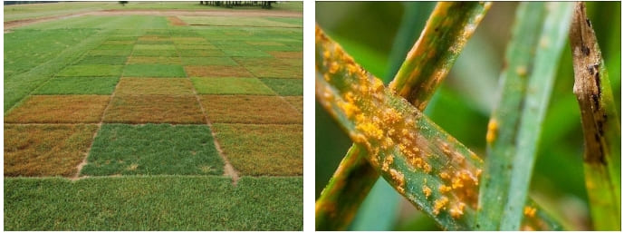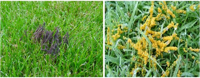 Имеет несколько видов, в основном «стеблевая» и «листовая». Возбудитель грибы из родов Puccinia и Uromices. Ржавчина имеет сложный жизненный цикл и производит 5 видов спор , но только уредоспоры наиболее вредоносны в газонах. К тому же ржавчинные грибы имеют несколько «промежуточных» хозяев, таких как сосны, барбарис, боярышник, где болезнь протекает в весенний период, по логике их и надо обрабатывать в первую очередь. Поспешу успокоить газоноводов, ржавчина не наносит сильных повреждений газону, скорее это отражается на декоративности газона в период заболевания. Исключение составляет появление ржавчины на молодых всходах, как осенью, так и весной, здесь действительно могут быть серьезные проблемы и гибель газона.