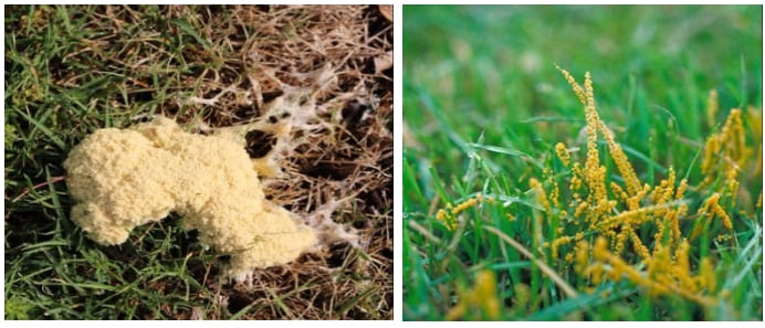Не инфекционное заболевание, да и вообще не заболевание. Вызывается выходом на поверхность особого рода микроорганизмов, живущих в почве и войлоке, и занимающих промежуточное состояние между грибами (наличие спор) и животным миром. Организмы, вызывающие слизистую плесень, — это не грибы, а грибоподобные протисты. Наиболее распространены виды Physarum cinereum и Mucilago crustacea. Они питаются почвенными микробами, а также получают питание из неживых органических веществ в соломе. При благоприятных условиях слизь заполнится темными массами спор. При высыхании плесень становится более темной, иногда черной. Издалека масса может даже напоминать сигаретный пепел. Прохладная влажная погода способствует прорастанию спор, а теплая влажная погода способствует перемещению слизи назад в дерн. Период появления с апреля по сентябрь, обычно во время сильных дождей сменивших длительную засуху, но бывает и после схода снега. Образования могут быть различными по форме и цвету от, фиолетового до белого, оранжевого, серого, и представляют собой массу спор.