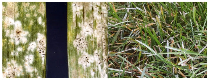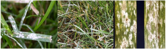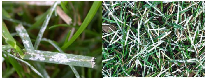 Возбудители Blurmeria graminis, Erysiphe graminis. Облигатный паразит поражающий только живую ткань. Проявляется в виде белого налета на листьях, «как будто сбрызнули побелкой». При благоприятных условиях окружающей среды, грибок производит огромное количество бесполых спор, так называемых конидий на поверхности зараженных листьев, давая им «мучнистый» внешний вид, отсюда и название «настоящая мучнистая роса». Конидии ветром разносятся на соседние растения (аэрогенная инфекция), заражая их через 2 часа после контакта. Особенностью развития патогена мучнистой росы является то, что рост мицелия идет по поверхности листа. Попав на лист хозяина, гриб с помощью гаусторий проникает сквозь кутикулу листа и начинает паразитировать, перехватывая пищу и воду. Сильное развитие идет в тени, где испарение меньше. Именно из-за риска возникновения этой болезни, приводящей в конечном результате к гибели, не рекомендуют сеять или укладывать рулоны из 100% мятлика в тени, хотя есть сорта, относительно неплохо чувствующие себя в тени. Для тени лучше использовать смеси на основе овсяниц, или мятлика с овсяницей, очень неплохо показывает себя щучка (луговик дернистый), еще лучше мятлик приземистый Poa Supina. Возникает, как правило, в прохладную и влажную погоду, еще большему распространению способствует чередование жаркой и сухой погоды с прохладной и влажной. Бывает, что возникает весной как на тенистых, так и на солнечных участках, но на солнце проходит довольно быстро.