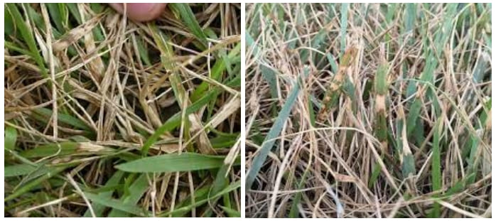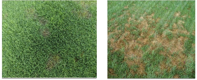 На правой фотографии уже активное развитие заболевания, так оно проходит в тех районах, где нет снега, зачастую там диаметр пятен не превышает 5 см. В регионах где снежный покров устойчивый более 60 дней пятно может разрастись до 30 см в диаметре. Очень часто пятна сливаются друг с другом, и создается картина сплошного поражения.