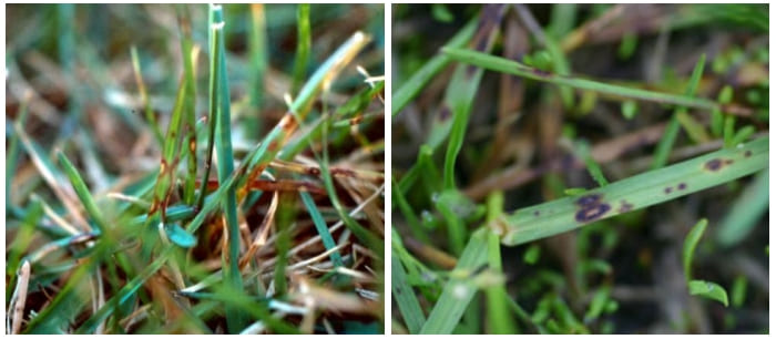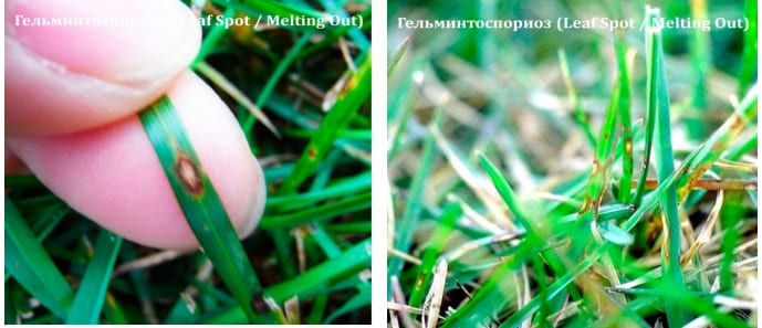 Проявляется в виде листовой пятнистости и разреживания травостоя. Вызывается возбудителями Drechslera poae и Bipolaris cynodontis, Bipolaris Sorokiniana (ранее наименование Helmintosporium). И если Bipolaris поражает многие виды трав, то Drechslera поражает исключительно мятлик. Но протекают они, как правило, вместе. Симптомы проявляются с мая по сентябрь, если в это время стоит теплая, влажная погода. Очевидное проявление когда температура начинает превышать 20°С, и с повышением температуры болезнь все более активизируется, наибольшая вредоносность при температурах выше 30°С и высокой влажности. В ранних стадиях проявляется сначала листовая пятнистость, в виде небольших точек на листьях коричневого, фиолетового или черного цвета, в дальнейшем пятно увеличивается, центр его приобретает желтую окраску с четко выраженной окантовкой коричневого или черного цветов. Вокруг окантовки может быть желтый ореол. По мере того как пятна расширяются, они начинают сливаться в единое целое, что приводит к отмиранию листа. Постепенно болезнь распространяется на все растение, вызывая его гибель, и как следствие разреживание травостоя. В тени, в условиях недостаточной освещенности, избыточной влажности и отсутствии проветривания может протекать особенно тяжело.