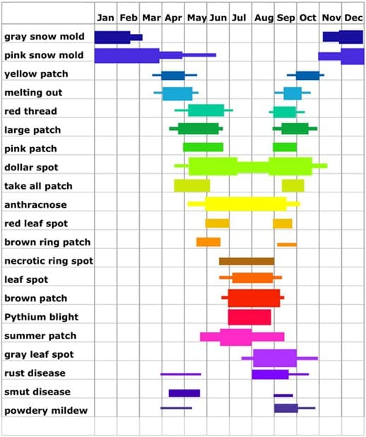 Газон — живой организм и конечно подвержен болезням, которые время от времени проявляются. Нельзя сказать, что если по сроку, когда болезнь обычно себя проявляет она обязательно появиться. Может появиться, а может и нет, есть очень много факторов от чего это зависит, в основном погодные условия и условия содержания. Можно сказать и так, что спектр болезней зависит от уровня агротехники.